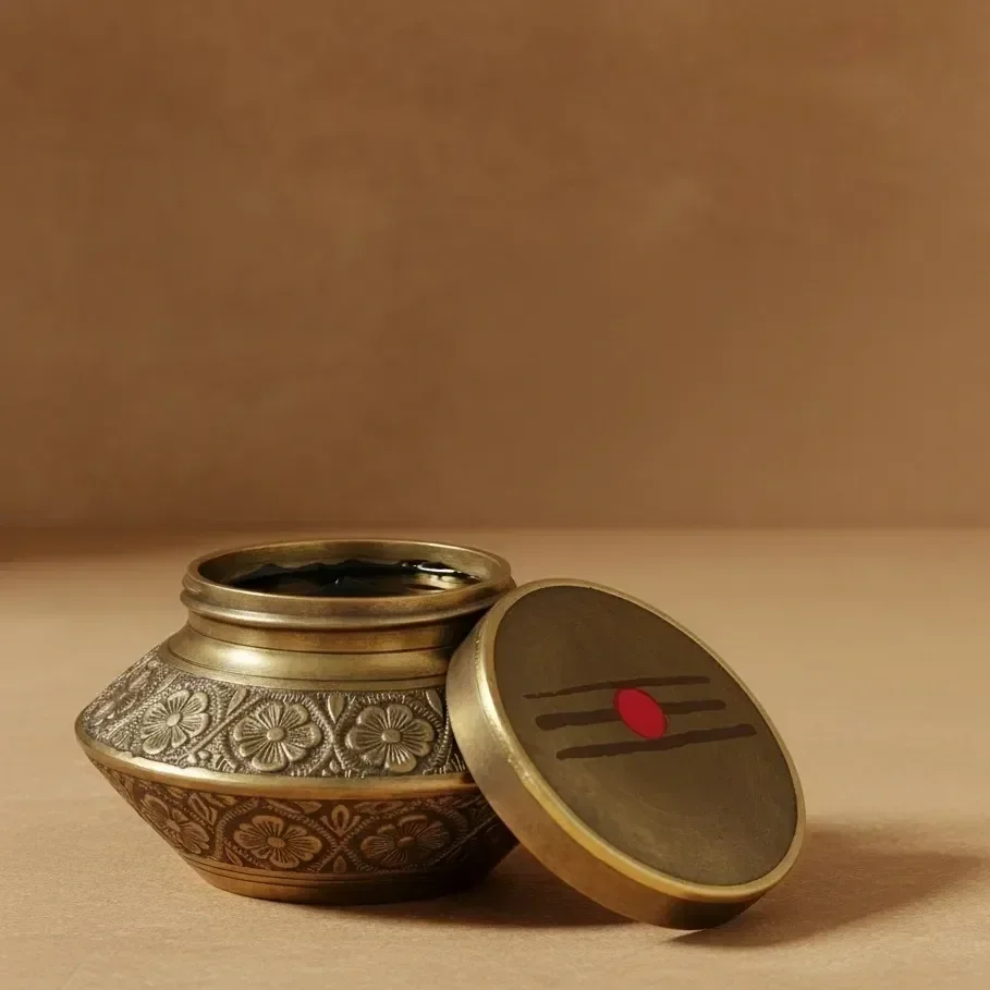 The cloth is then rolled into a wick, lit in a lamp fueled with cold-pressed castor oil, and a copper plate is placed above to collect the medicated soot—the source of our kajal’s deep black color. This soot is carefully combined with Desi cow’s ghee, cold-pressed castor oil, Pachakarpoora, and beeswax to create a soft, nourishing formula.